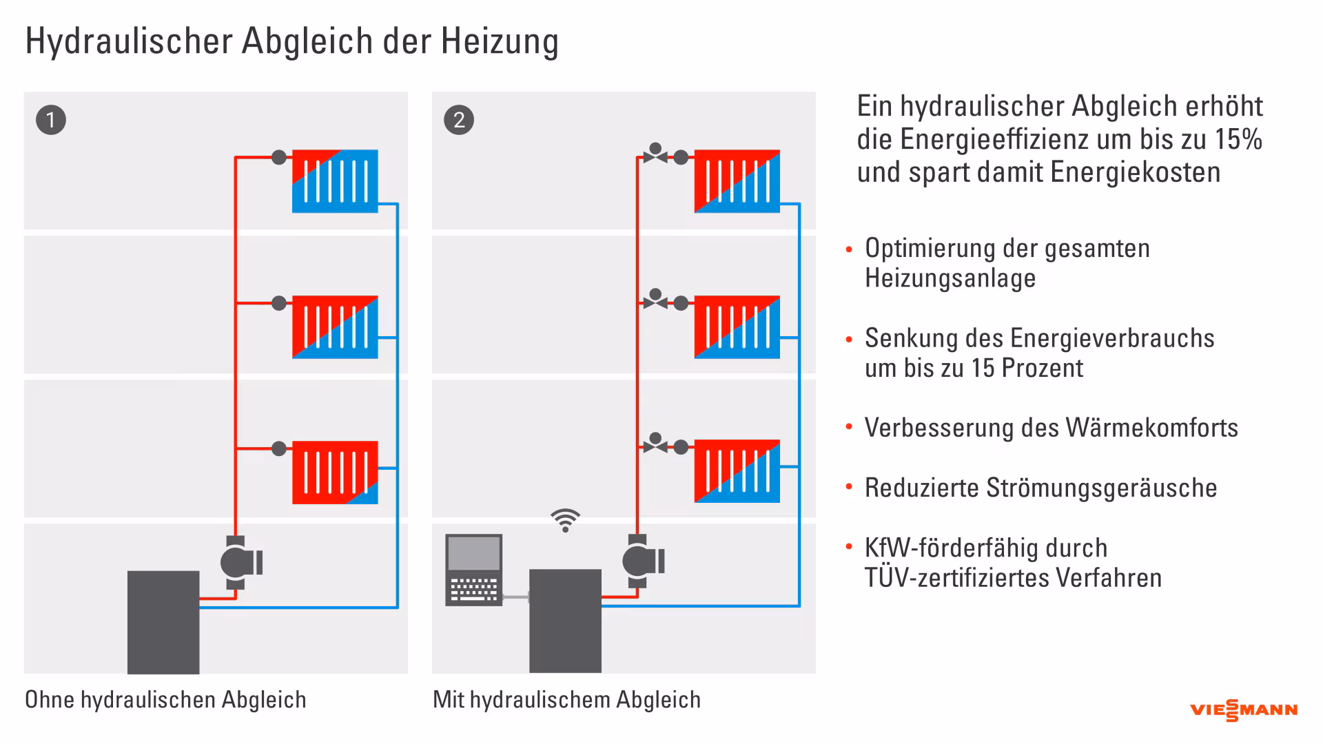Mit Hilfe eines hydraulische Abgleichs können Sie eine gleichmäßigere Wasser- und Wärmeverteilung Ihres Gebäudes erzielen. So senken Sie Ihren Energiebedarf, da immer die optimale Wassermenge alle Heizkörper erreicht. So gibt es keine unterkühlten oder überhitzten Räume mehr und laute Fließgeräusche an den Ventilen werden reduziert.